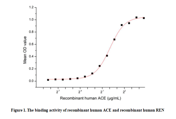 Angiotensin I Converting Enzyme (ACE) is a zinc-dependent metalloprotease that plays a crucial role in the renin-angiotensin system (RAS), regulating blood pressure and fluid balance. ACE converts the inactive angiotensin I into the potent vasoconstrictor angiotensin II, which increases blood pressure by constricting blood vessels and stimulating aldosterone secretion. Additionally, ACE degrades bradykinin, a vasodilator, further promoting hypertension.Besides,Renin (REN) has been identified as an interactor of ACE, thus a functional binding ELISA assay was conducted to detect the interaction of recombinant human ACE and recombinant human REN . Briefly, biotin-linked ACE were diluted serially in PBS, with 0.01% BSA (pH 7.4). Duplicate samples of 100μl were then transferred to REN-coated microtiter wells and incubated for 1h at 37℃. Wells were washed with PBST 3 times and incubation with Streptavidin-HRP for 30min, then wells were aspirated and washed 5 times. With the addition of substrate solution, wells were incubated 15-25 minutes at 37℃. Finally, add 50µl stop solution to the wells and read at 450nm immediately. The binding activity of ACE and REN was shown in Figure 1, the EC50 for this effect is1.035µg/mL.