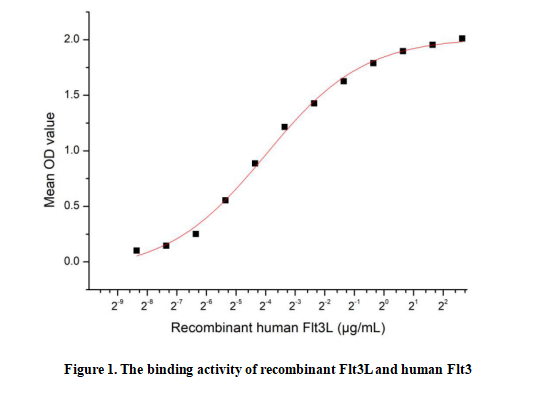 FMS-like tyrosine kinase 3 ligand (Flt3L) is a crucial hematopoietic cytokine primarily produced by bone marrow stromal cells and lymphocytes. It functions as a key regulator for the proliferation, differentiation, and survival of early hematopoietic progenitor cells and dendritic cells. Due to its vital role in stimulating the immune system, Flt3L is extensively investigated as a potential therapeutic agent in cancer immunotherapy and for enhancing immune reconstitution following bone marrow transplantation. Its mechanism of action is exclusively mediated through binding and activation of its cognate receptor, Flt3 is a type III receptor tyrosine kinase expressed on the surface of target cells. This specific ligand-receptor interaction induces Flt3 dimerization and autophosphorylation, initiating critical intracellular signaling cascades, such as the MAPK and PI3K pathways, that drive cell proliferation and differentiation.Thus a functional ELISA assay was conducted to detect the interaction of recombinant human Flt3L and recombinant human Flt3. Briefly, Flt3L was diluted serially in PBS with 0.01% BSA (pH 7.4). Duplicate samples of 100 μL were then transferred to Flt3-coated microtiter wells and incubated for 1h at 37℃. Wells were washed with PBST and incubated for 1h with anti-Flt3L pAb, then aspirated and washed 3 times. After incubation with HRP labeled secondary antibody for 1h at 37℃, wells were aspirated and washed 5 times. With the addition of substrate solution, wells were incubated 15-25 minutes at 37℃. Finally, add 50 µL stop solution to the wells and read at 450/630nm immediately. The binding activity of recombinant human Flt3L and recombinant human Flt3 was shown in Figure 1, the EC50 for this effect is 0.06262 µg/mL.