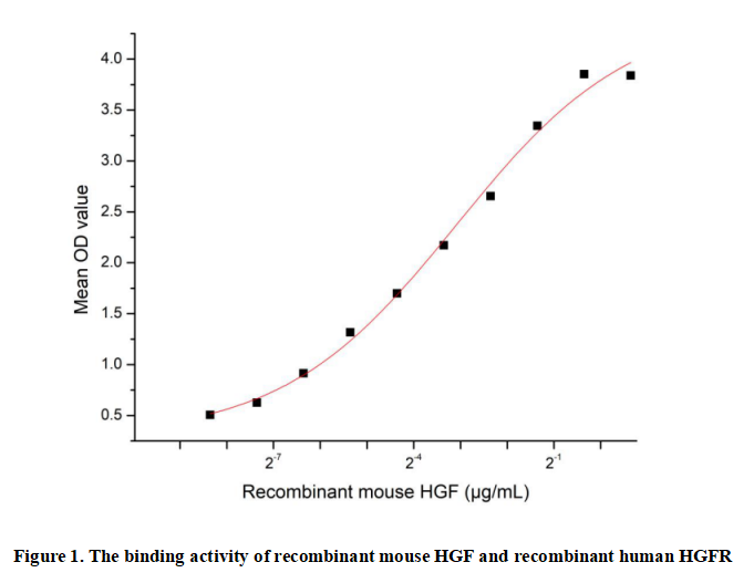 Hepatocyte Growth Factor (HGF), also known as scatter factor, is a pleiotropic cytokine primarily produced by mesenchymal cells. It plays crucial roles in embryonic development, tissue regeneration, and wound healing by mediating cell proliferation, motility, and morphogenesis. HGF is synthesized as an inactive single-chain precursor (pro-HGF) that is proteolytically cleaved to form the active heterodimer. Its signaling is vital in organogenesis and contributes to pathological processes like cancer metastasis when dysregulated. HGF binds specifically to its receptor, HGFR (c-MET), triggering intracellular pathways that promote cellular responses including proliferation and migration.To detect the activity of recombinant HGF a functional ELISA assay was performed to evaluate the interaction between recombinant mouse HGF and recombinant human HGFR.Briefly, HGF was diluted serially in PBS with 0.01% BSA (pH 7.4). Duplicate samples of 100 μl were then transferred to HGFR-coated microtiter wells and incubated for 1h at 37℃. Wells were washed with PBST and incubated for 1h with anti-HGF pAb, then aspirated and washed 3 times. After incubation with HRP labelled secondary antibody for 1h at 37℃, wells were aspirated and washed 5 times. With the addition of substrate solution, wells were incubated 15-25 minutes at 37℃. Finally, add 50 µL stop solution to the wells and read at 450/630nm immediately. The binding activity of recombinant mouse HGF and recombinant human HGFR was shown in Figure 1, the EC50 for this effect is 0.12µg/mL.