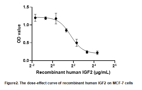 Insulin Like Growth Factor 2 (IGF2) is a key peptide hormone with critical roles in growth, development, and metabolism. It exerts its effects by binding to the IGF1 receptor (IGF1R) and insulin receptor (IR), activating downstream signaling pathways that promote cell proliferation, survival, and differentiation. As IGF2 has the function of cell proliferation , we measure the activity of recombinant human IGF2 by the ability of the protein to stimulate MCF-7 cells proliferation. MCF-7 cells were seeded into triplicate wells of 96-well plates and allowed to attach, replaced with various concentrations of recombinant human IGF2. After incubated for 72h, cells were observed by inverted microscope and cell proliferation was measured by Cell Counting Kit-8 (CCK-8). Briefly, 10 µl of CCK-8 solution was added to each well of the plate, then the absorbance at 450 nm was measured using a microplate reader after incubating the plate for 1-4 hours at 37 ℃. Cell viability was assessed by CCK-8 assay after incubation with recombinant human IGF2 for 72h. The result was shown in Figure 1. It was obvious that IGF2 significantly increased cell viability of MCF-7 cells. The ED50 of recombinant human IGF2 is 3.339 μg/ml.