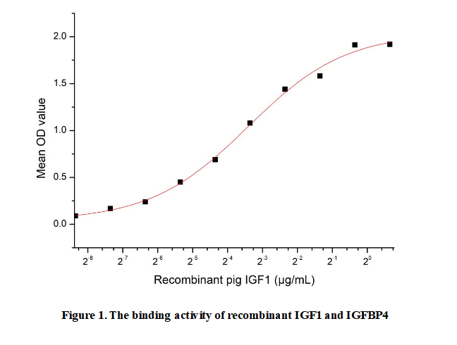 Insulin Like Growth Factor Binding Protein 4 (IGFBP4), corresponding to product code A055Ra, is a key member of the IGFBP family, widely expressed in tissues like the liver, kidneys, and bones. Its primary role is to regulate the biological activity of Insulin Like Growth Factors (IGFs). By binding to IGFs, it controls their free concentration in the circulation, prevents rapid degradation, and modulates their transport to target tissues. IGFBP4 also participates in processes such as cell proliferation, differentiation, and tissue development, with implications in growth disorders and cancer research. IGFBP4 (A055Ra) specifically binds to IGF1 (A050Po), regulating IGF1’s availability to its receptors and thus its biological effects.Briefly, IGF1 was diluted serially in PBS with 0.01% BSA (pH 7.4). Duplicate samples of 100 μl were then transferred to IGFBP4-coated microtiter wells and incubated for 1h at 37℃. Wells were washed with PBST and incubated for 1h with anti-IGF1 pAb, then aspirated and washed 3 times. After incubation with HRP labelled secondary antibody for 1h at 37℃, wells were aspirated and washed 5 times. With the addition of substrate solution, wells were incubated 15-25 minutes at 37℃. Finally, add 50 µL stop solution to the wells and read at 450/630nm immediately.Measured by its binding ability in a functional ELISA. When Recombinant IGFBP4 is lmmobilized at 2 µg/mL(100 uLwell), the concentration of IGF1 that produces 50% optimal bindingresponse is found to be approximately 0.0938 µg/mL.
