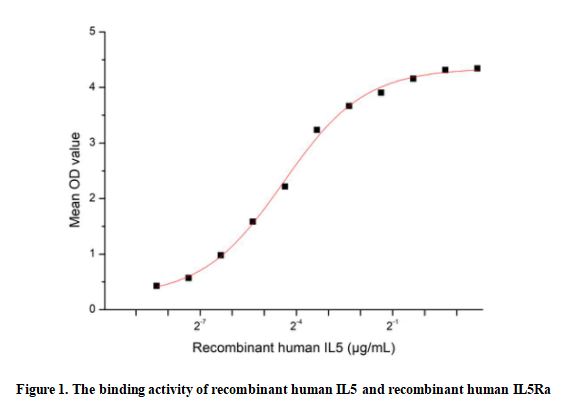 Interleukin 5 (IL5) is a T cell-derived cytokine crucial for eosinophil growth, differentiation, and activation, playing key roles in allergic inflammation and parasite defense. This homodimeric glycoprotein signals through the interleukin 5 receptor complex, composed of IL5Ra (CD125) and common beta chain (CD131). IL5 specifically binds IL5Ra with high affinity , initiating JAK/STAT signaling pathways that promote eosinophil survival and function.To detect the activity of recombinant IL5, a functional ELISA assay was performed to evaluate the interaction between recombinant human IL5 and recombinant human IL5.Briefly, IL5 was diluted serially in PBS with 0.01% BSA (pH 7.4). Duplicate samples of 100 μl were then transferred to IL5Ra-coated microtiter wells and incubated for 1h at 37℃. Wells were washed with PBST and incubated for 1h with anti-IL5 pAb, then aspirated and washed 3 times. After incubation with HRP labelled secondary antibody for 1h at 37℃, wells were aspirated and washed 5 times. With the addition of substrate solution, wells were incubated 15-25 minutes at 37℃. Finally, add 50 µL stop solution to the wells and read at 450/630nm immediately. The binding activity of recombinant human IL5 and recombinant human IL5Ra was shown in Figure 1, the EC50 for this effect is 0.047µg/mL.