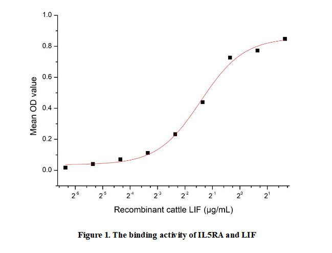 Leukemia Inhibitory Factor (LIF) is a multifunctional cytokine belonging to the interleukin-6 (IL-6) family. First identified in 1987 for its ability to inhibit the proliferation of myeloid leukemia cells and induce their differentiation, LIF is now recognized for broader biological roles. It is produced by various cell types, including fibroblasts, endothelial cells, and immune cells like T lymphocytes and macrophages. Beyond hematology, LIF plays critical roles in embryonic development—supporting the self-renewal of embryonic stem cells in mice—and tissue repair, inflammation regulation, and neural function. Its signaling occurs via binding to a heterodimeric receptor complex, activating downstream pathways like JAK-STAT and MAPK. Dysregulated LIF expression has been linked to diseases such as cancer, autoimmune disorders, and neurodegenerative conditions, making it a potential therapeutic target.Besides,IL5RA has been identified as an interactor of LIF, thus a functional binding ELISA assay was conducted to detect the interaction of recombinant human LIF and recombinant human IL5RA.Briefly, biotin-linked LIF were diluted serially in PBS, with 0.01% BSA (pH 7.4). Duplicate samples of 100µl were then transferred to IL5RA-coated microtiter wells and incubated for 1h at 37℃. Wells were washed with PBST 3 times and incubation with Streptavidin-HRP for 30min, then wells were aspirated and washed 5 times. With the addition of substrate solution, wells were incubated 15-25 minutes at 37℃. Finally, add 50µl stop solution to the wells and read at 450nm immediately. The binding activity of LIF and IL5RA was shown in Figure 1, the EC50 for this effect is 0.37163µg/mL.