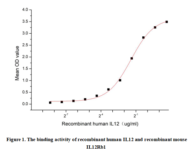 Interleukin 12 (IL12) is a heterodimeric cytokine composed of p35 (IL12A) and p40 (IL12B) subunits, primarily produced by dendritic cells, macrophages, and B cells. It plays a critical role in bridging innate and adaptive immunity by promoting Th1 differentiation, enhancing IFN-γ production, and stimulating NK and T cell cytotoxicity. IL12 is pivotal in anti-tumor and anti-infectious responses but dysregulation can contribute to autoimmunity.IL12 binds IL12Rb1 (a subunit of IL12 receptor) with high affinity, initiating JAK-STAT signaling.Thus a functional binding ELISA assay was conducted to detect the interaction of recombinant human IL12 and recombinant mouse IL12Rb1 .Briefly, biotin-linked IL12 were diluted serially in PBS, with 0.01% BSA (pH 7.4). Duplicate samples of 100μl were then transferred to IL12Rb1-coated microtiter wells and incubated for 1h at 37℃. Wells were washed with PBST 3 times and incubation with Streptavidin-HRP for 30min, then wells were aspirated and washed 5 times. With the addition of substrate solution, wells were incubated 15-25 minutes at 37℃. Finally, add 50µl stop solution to the wells and read at 450nm immediately. The binding activity of IL12 and IL12Rb1 was shown in Figure 1, the EC50 for this effect is 0.37ug/mL.