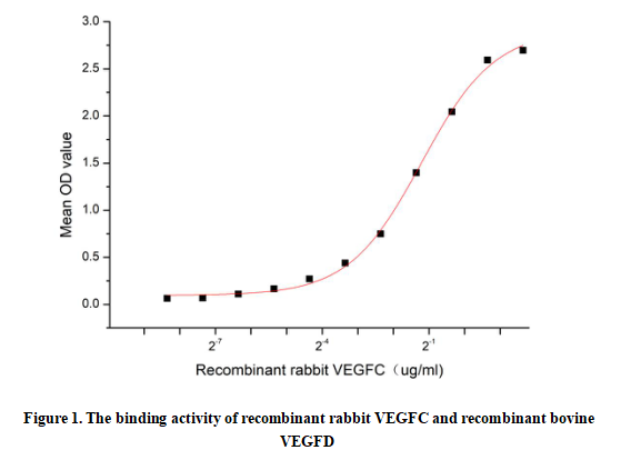Vascular Endothelial Growth Factor C (VEGFC) is a key lymphangiogenic factor that primarily binds to VEGFR-3 (FLT4), promoting lymphatic endothelial cell proliferation, migration, and survival. It also activates VEGFR-2 (KDR) upon proteolytic processing, contributing to angiogenesis. VEGFC is essential for embryonic lymphatic development and adult lymphatic remodeling.Besides,Vascular Endothelial Growth Factor D (VEGFD) has been identified as an interactor of VEGFC, thus a functional binding ELISA assay was conducted to detect the interaction of recombinant rabbit VEGFC and recombinant bovine VEGFD . Briefly, biotin-linked VEGFC were diluted serially in PBS, with 0.01% BSA (pH 7.4). Duplicate samples of 100μl were then transferred to VEGFD-coated microtiter wells and incubated for 1h at 37℃. Wells were washed with PBST 3 times and incubation with Streptavidin-HRP for 30min, then wells were aspirated and washed 5 times. With the addition of substrate solution, wells were incubated 15-25 minutes at 37℃. Finally, add 50µl stop solution to the wells and read at 450nm immediately. The binding activity of recombinant rabbit VEGFC and recombinant bovine VEGFD was shown in Figure 1, the EC50 for this effect is 0.43ug/mL.