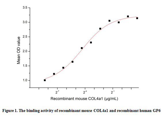 Collagen Type IV Alpha 1 (COL4a1) is a key structural component of basement membranes. It forms a network with other type IV collagen chains to provide mechanical stability and organizational scaffolding for tissues. Primarily expressed in vascular, renal, and neural tissues, COL4A1 mutations are associated with a spectrum of disorders, including hereditary angiopathy with nephropathy, aneurysms, and muscle cramps (HANAC) syndrome, as well as porencephaly and hemorrhagic stroke. These mutations disrupt extracellular matrix integrity, leading to vascular fragility and tissue dysfunction. Beyond its structural role, COL4A1 interacts with signaling molecules to regulate cell adhesion and differentiation. Its critical function in tissue development and maintenance makes it a focus of research in genetic and vascular diseases.Besides,Glycoprotein VI (GP6) has been identified as an interactor of COL4a1, thus a functional binding ELISA assay was conducted to detect the interaction of recombinant mouse COL4a1 and recombinant human GP6. Briefly, COL4a1 was diluted serially in PBS with 0.01% BSA (pH 7.4). Duplicate samples of 100 μl were then transferred to GP6-coated microtiter wells and incubated for 1h at 37℃. Wells were washed with PBST and incubated for 1h with anti-COL4a1 pAb, then aspirated and washed 3 times. After incubation with HRP labelled secondary antibody for 1h at 37℃, wells were aspirated and washed 5 times. With the addition of substrate solution, wells were incubated 15-25 minutes at 37℃. Finally, add 50 µL stop solution to the wells and read at 450/630nm immediately. The binding activity of recombinant mouse COL4a1 and recombinant human GP6 was shown in Figure 1, the EC50 for this effect is 0.05µg/mL.