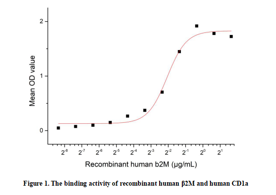 Beta-2-microglobulin (β2M, encoded by B2M) is a small, non-glycosylated protein with a molecular mass of approximately 12 kDa. It is ubiquitously expressed on the surface of nearly all nucleated cells and serves as an invariant light chain of major histocompatibility complex (MHC) class I molecules. β2M plays a critical role in stabilizing the conformation of MHC class I heavy chains and facilitating the presentation of endogenous peptide antigens to cytotoxic T lymphocytes, which is essential for cellular immune surveillance and antiviral and antitumor responses. Elevated serum β2M levels are often associated with immune activation, lymphoproliferative disorders, renal dysfunction, and certain inflammatory conditions. Structurally, it belongs to the immunoglobulin superfamily and is also involved in cell adhesion and antigen recognition processes. β2M forms a stable structural complex with CD1a to support lipid antigen presentation and T-cell recognition. Briefly, CD1a was diluted serially in PBS with 0.01% BSA (pH 7.4). Duplicate samples of 100 μl were then transferred to β2M-coated microtiter wells and incubated for 1h at 37℃. Wells were washed with PBST and incubated for 1h with anti-CD1a pAb, then aspirated and washed 3 times. After incubation with HRP labelled secondary antibody for 1h at 37℃, wells were aspirated and washed 5 times. With the addition of substrate solution, wells were incubated 15-25 minutes at 37℃. Finally, add 50 µL stop solution to the wells and read at 450/630nm immediately. Measured by its binding ability in a functional ELISA. When recombinant human β2M is lmmobilized at 2 µg/mL(100 µLwell), the concentration of CD1a that produces 50% optimal bindingresponse is found to be approximately 0.239 µg/mL.