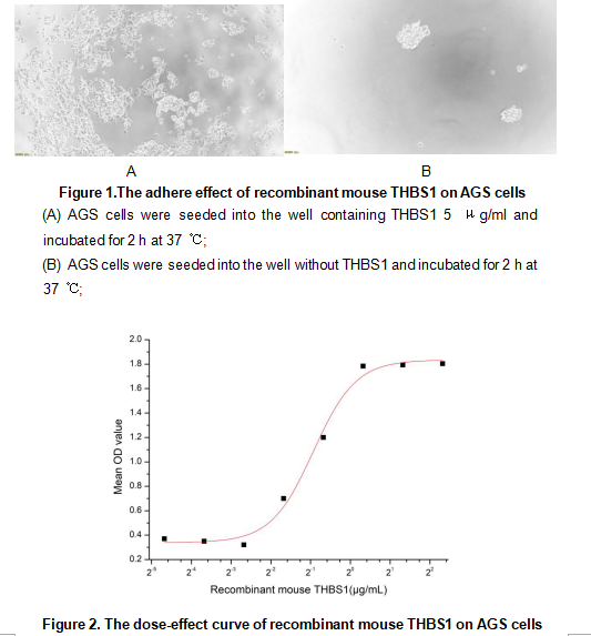Thrombospondin 1 (THBS1) is a matricellular glycoprotein that critically mediates cell–matrix interactions. It promotes cell adhesion by binding to cell surface receptors, including integrins such as αvβ3 and α4β1, and non-integrin receptors like CD36 and CD47. Through its multiple domains, THBS1 forms a molecular bridge between the extracellular matrix and the cell membrane, facilitating focal adhesion assembly and cytoskeletal organization. This adhesive function is essential for modulating cellular processes such as migration, proliferation, and survival, positioning THBS1 as a key regulator in tissue remodeling, wound healing, and angiogenesis. As THBS1 has the function of cell adhesion, we measure the activity of recombinant mouse THBS1 by the ability of the immobilized protein to support the adhesion of AGS cell. When cells are added to different concentrations of recombinant mouse THBS1 coated plates, cells will adhere after 2 hour incubation at 37 ℃. The adhesion of AGS after 2 hour incubation at 37 ℃ observed by inverted microscope was shown in Figure 1. Cell adherent was in a dose dependent manner, the result was shown in Figure 2, the EC50 was 0.6 μg/ml.