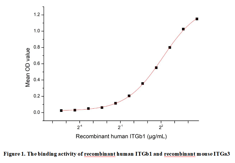 Integrin Beta 1 (ITGb1) is a fundamental transmembrane receptor that mediates bidirectional signaling between cells and the extracellular matrix (ECM). As the most ubiquitously expressed β integrin subunit, ITGb1 partners with different α subunits to form functional heterodimers that regulate critical cellular processes including adhesion, migration, proliferation, and differentiation. This versatile receptor plays indispensable roles in embryogenesis, wound healing, and immune cell trafficking through its ability to transmit both mechanical and biochemical signals across the plasma membrane. The dysregulation of ITGb1 function has been implicated in various pathological conditions, particularly tumor metastasis, tissue fibrosis, and chronic inflammatory disorders. ITGb1 specifically combines with ITGa3 through non-covalent interactions to form the ɑ3β1 integrin heterodimer, a key laminin receptor that mediates cell-ECM adhesion and subsequent intracellular signaling cascades.Thus a functional binding ELISA assay was conducted to detect the interaction of recombinant human ITGb1 and recombinant mouse ITGa3 . Briefly, biotin-linked ITGb1 were diluted serially in PBS, with 0.01% BSA (pH 7.4). Duplicate samples of 100μl were then transferred to ITGa3-coated microtiter wells and incubated for 1h at 37℃. Wells were washed with PBST 3 times and incubation with Streptavidin-HRP for 30min, then wells were aspirated and washed 5 times. With the addition of substrate solution, wells were incubated 15-25 minutes at 37℃. Finally, add 50µl stop solution to the wells and read at 450nm immediately. The binding activity of recombinant human ITGb1 and recombinant mouse ITGa3 was shown in Figure 1, the EC50 for this effect is 4.33µg/mL.