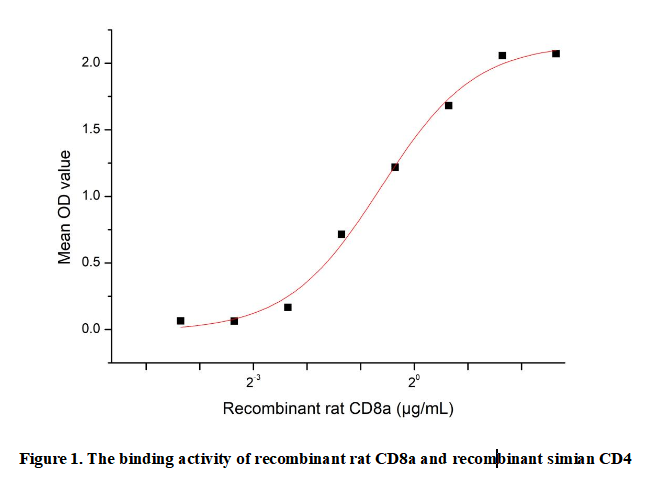Cluster Of Differentiation 8a (CD8a) is a cell surface glycoprotein predominantly found on cytotoxic T cells and natural killer cells. It serves as a coreceptor for the T cell receptor, binding to MHC class I molecules to enhance antigen recognition and T cell activation. Structurally, CD8α can form heterodimers with CD8β or homodimers, with the heterodimeric form being most common on cytotoxic T cells. This molecule plays a vital role in adaptive immunity by facilitating the elimination of virus-infected and cancerous cells. Beyond its effector functions, CD8α is essential for T cell development in the thymus.Besides,ACluster Of Differentiation 4 (CD4) has been identified as an interactor of CD8a, thus a functional binding ELISA assay was conducted to detect the interaction of recombinant rat CD8a and recombinant simian CD4 . Briefly, biotin-linked CD8a were diluted serially in PBS, with 0.01% BSA (pH 7.4). Duplicate samples of 100μl were then transferred to CD4-coated microtiter wells and incubated for 1h at 37℃. Wells were washed with PBST 3 times and incubation with Streptavidin-HRP for 30min, then wells were aspirated and washed 5 times. With the addition of substrate solution, wells were incubated 15-25 minutes at 37℃. Finally, add 50µl stop solution to the wells and read at 450nm immediately. The binding activity of recombinant rat CD8a and recombinant simian CD4 was shown in Figure 1, the EC50 for this effect is 0.65µg/mL.