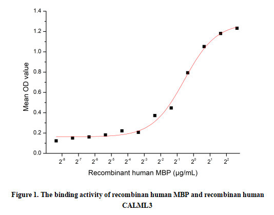 Myelin basic protein (MBP), a 18.5-kDa encephalitogenic peptide, is the second most abundant in central nervous system and responsible for adhesion of the cytosolic surfaces of multilayered compact myelin, MBP is biased expressed in cerebellum adult and cortex adult. It can interact with a number of polyanionic proteins including actin, tubulin, Ca(2 )-calmodulin, and clathrin, and negatively charged lipids, and acquires structure on binding to them. Calmodulin Like Protein 3 (CALML3) is a kind of Ca(2 )-calmodulin, thus a functional binding ELISA assay was conducted to detect the interaction of recombinant human MBP and recombinant human CALML3.Briefly, MBP was diluted serially in PBS with 0.01% BSA (pH 7.4). Duplicate samples of 100 μl were then transferred to CALML3-coated microtiter wells and incubated for 1h at 37℃. Wells were washed with PBST and incubated for 1h with anti-MBP pAb, then aspirated and washed 3 times. After incubation with HRP labelled secondary antibody for 1h at 37℃, wells were aspirated and washed 5 times. With the addition of substrate solution, wells were incubated 15-25 minutes at 37℃. Finally, add 50 µL stop solution to the wells and read at 450/630nm immediately. The binding activity of ecombinant human MBP and recombinant human CALML3 was shown in Figure 1, the EC50 for this effect is 0.081µg/mL..