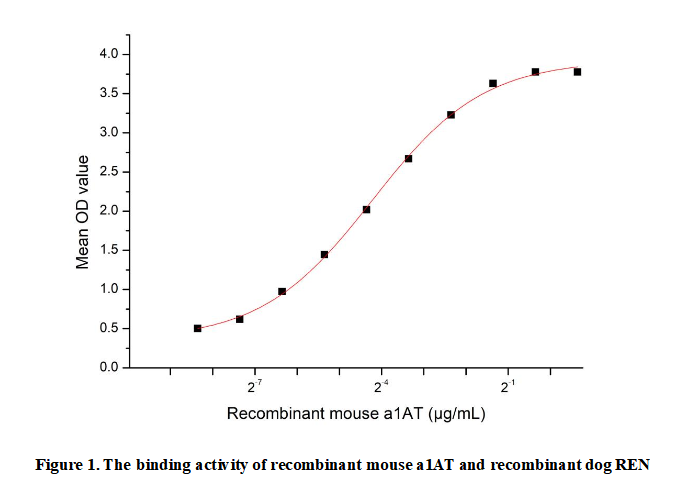 Alpha-1-Antitrypsin (a1AT), a major serine protease inhibitor synthesized primarily in the liver, is crucial for protecting tissues from excessive proteolytic damage. Circulating in human plasma, it targets and inhibits a range of proteases—including neutrophil elastase, trypsin, and chymotrypsin—which, if left unregulated, can degrade essential structural proteins. Beyond its protective function, A1AT is involved in modulating inflammatory responses and maintaining pulmonary homeostasis; deficiencies in A1AT are associated with conditions such as emphysema and liver disorders. Notably, A1AT can directly bind to and inhibit Renin (REN), a central enzyme in the renin-angiotensin system, thereby modulating its proteolytic activity.To detect the activity of recombinant a1AT , a functional ELISA assay was performed to evaluate the interaction between recombinant mouse a1AT and recombinant dog REN.Briefly, a1AT was diluted serially in PBS with 0.01% BSA (pH 7.4). Duplicate samples of 100 μl were then transferred to REN-coated microtiter wells and incubated for 1h at 37℃. Wells were washed with PBST and incubated for 1h with anti-a1AT pAb, then aspirated and washed 3 times. After incubation with HRP labelled secondary antibody for 1h at 37℃, wells were aspirated and washed 5 times. With the addition of substrate solution, wells were incubated 15-25 minutes at 37℃. Finally, add 50 µL stop solution to the wells and read at 450/630nm immediately. The binding activity of recombinant mouse a1AT and recombinant dog REN was shown in Figure 1, the EC50 for this effect is 0.054 µg/mL..