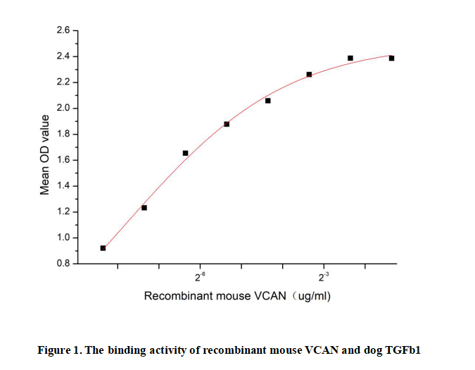Versican (VCAN) is a large extracellular matrix proteoglycan that plays critical roles in tissue development, inflammation, and cell adhesion by interacting with hyaluronan and other ECM components. It regulates tissue hydration, structural integrity, and immune cell migration, contributing to cardiovascular disease, cancer progression, and fibrosis through modulation of cell proliferation and matrix remodeling. Proteolytic cleavage of VCAN releases bioactive fragments that influence cellular signaling. Importantly, VCAN binds and sequesters TGFβ1 in the ECM, controlling its bioavailability; upon VCAN cleavage, TGFβ1 is released, activating downstream signaling pathways involved in fibrosis, immune regulation, and tissue repair.Thus a functional ELISA assay was conducted to detect the interaction of recombinant mouse VCAN and recombinant dog TGFb1. Briefly, VCAN was diluted serially in PBS with 0.01% BSA (pH 7.4). Duplicate samples of 100 μl were then transferred to TGFb1-coated microtiter wells and incubated for 1h at 37℃. Wells were washed with PBST and incubated for 1h with anti-VCAN pAb, then aspirated and washed 3 times. After incubation with HRP labelled secondary antibody for 1h at 37℃, wells were aspirated and washed 5 times. With the addition of substrate solution, wells were incubated 15-25 minutes at 37℃. Finally, add 50 µL stop solution to the wells and read at 450/630nm immediately. The binding activity of recombinant mouse VCAN and recombinant dog TGFb1 was shown in Figure 1, the EC50 for this effect is 0.005ug/mL.