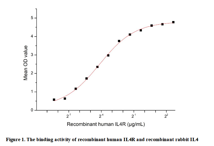 Interleukin 4 Receptor (IL4R) is a transmembrane protein that plays a pivotal role in the immune system, particularly in mediating type 2 immune responses. Signaling through IL4R promotes B-cell activation, antibody class switching to IgE, and differentiation of Th2 cells, while also contributing to anti-inflammatory responses and alternative macrophage activation. Dysregulation of IL4R signaling is associated with allergic diseases, asthma, and certain parasitic infections. IL4R binds its cognate ligand Interleukin 4 (IL4) with high affinity, initiating dimerization of receptor subunits and subsequent activation of the JAK-STAT signaling pathway.To detect the activity of recombinant IL4R , a functional ELISA assay was performed to evaluate the interaction between recombinant human IL4R and recombinant rabbit IL4.Briefly, IL4R was diluted serially in PBS with 0.01% BSA (pH 7.4). Duplicate samples of 100 μl were then transferred to IL4-coated microtiter wells and incubated for 1h at 37℃. Wells were washed with PBST and incubated for 1h with anti-IL4R pAb, then aspirated and washed 3 times. After incubation with HRP labelled secondary antibody for 1h at 37℃, wells were aspirated and washed 5 times. With the addition of substrate solution, wells were incubated 15-25 minutes at 37℃. Finally, add 50 µL stop solution to the wells and read at 450/630nm immediately. The binding activity of recombinant human IL4R and recombinant rabbit IL4 was shown in Figure 1, the EC50 for this effect is 0.056µg/mL.