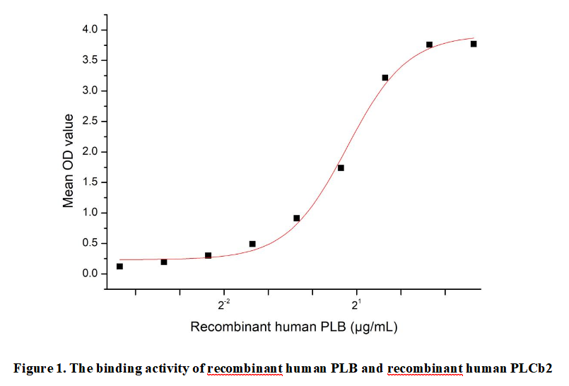 Phospholipase B (PLB) is a multifunctional enzyme that exhibits both phospholipase A1/A2 and lysophospholipase activities, enabling it to hydrolyze phospholipids at both the sn-1 and sn-2 positions. Primarily found in fungi, bacteria, and mammalian tissues, PLB plays critical roles in lipid metabolism, membrane remodeling, and signal transduction. In pathogenic fungi like Candida albicans, PLB contributes to virulence by facilitating host cell invasion and immune evasion.Besides,Phospholipase C Beta 2 (PLCb2) has been identified as an interactor of PLB, thus a functional binding ELISA assay was conducted to detect the interaction of recombinant human PLB and recombinant human PLCb2. Briefly, PLB was diluted serially in PBS with 0.01% BSA (pH 7.4). Duplicate samples of 100 μl were then transferred to PLCb2-coated microtiter wells and incubated for 1h at 37℃. Wells were washed with PBST and incubated for 1h with anti-PLB pAb, then aspirated and washed 3 times. After incubation with HRP labelled secondary antibody for 1h at 37℃, wells were aspirated and washed 5 times. With the addition of substrate solution, wells were incubated 15-25 minutes at 37℃. Finally, add 50 µL stop solution to the wells and read at 450/630nm immediately. The binding activity of recombinant human PLB and recombinant human PLCb2 was shown in Figure 1, the EC50 for this effect is 1.72 µg/mL.
