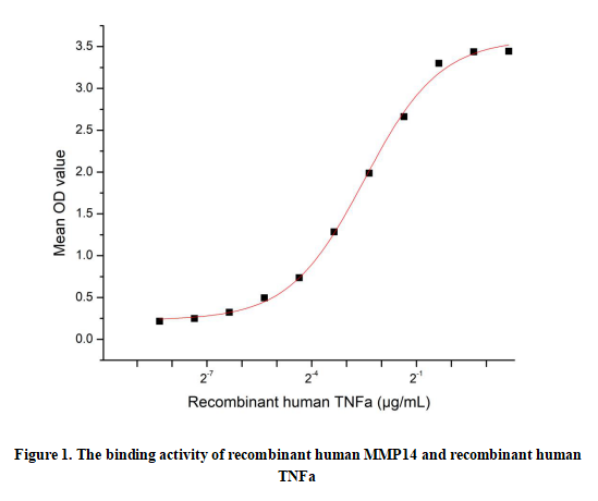 Matrix Metalloproteinase 14 (MMP14), also known as membrane-type 1 MMP (MT1-MMP), is a pivotal enzyme in the matrix metalloproteinase family. Unlike most MMPs secreted into the extracellular space, MMP14 is a transmembrane protease that anchors to the cell membrane. It plays a crucial role in degrading extracellular matrix (ECM) components, particularly collagen, thereby regulating tissue remodeling, wound healing, and developmental processes. Its ability to activate other MMPs, like MMP2, amplifies its proteolytic cascade. Importantly, MMP14 is a key mediator in cancer progression, facilitating tumor invasion, angiogenesis, and metastasis by breaking down physical barriers in the ECM. Its dysregulation is also linked to inflammatory and vascular diseases.Besides,Tumor Necrosis Factor Alpha (TNFa) has been identified as an interactor of MMP14, thus a functional binding ELISA assay was conducted to detect the interaction of recombinant human MMP14 and recombinant human TNFa. Briefly, biotin-linked TNFa were diluted serially in PBS, with 0.01% BSA (pH 7.4). Duplicate samples of 100µl were then transferred to MMP14-coated microtiter wells and incubated for 1h at 37℃. Wells were washed with PBST 3 times and incubation with Streptavidin-HRP for 30min, then wells were aspirated and washed 5 times. With the addition of substrate solution, wells were incubated 15-25 minutes at 37℃. Finally, add 50µl stop solution to the wells and read at 450nm immediately. Measured by its binding ability in a functional ELISA. When Recombinant MMP14 is lmmobilized at 2 µg/mL(100 uLwell), the concentration of TNFa that produces 50% optimal bindingresponse is found to be approximately 0.178 µg/mL.