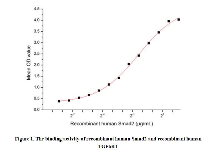 Mothers Against Decapentaplegic Homolog 2 (Smad2) is a pivotal intracellular mediator of the TGF-β signaling pathway that regulates diverse cellular processes including proliferation, differentiation, and apoptosis. As an R-Smad protein, Smad2 transduces signals from activated TGF-β receptors to the nucleus, where it modulates gene expression in complex with Smad4. Smad2 is essential for embryonic development and tissue homeostasis, with its dysfunction linked to cancer and fibrotic diseases. Following TGF-β stimulation, Smad2 binds to and is phosphorylated by the activated Transforming Growth Factor Beta Receptor I (TGFbR1), initiating downstream signaling cascades.To detect the activity of recombinant Smad2, a functional ELISA assay was performed to evaluate the interaction between recombinant human Smad2 and recombinant human TGFbR1.Briefly, biotin-linked Smad2 were diluted serially in PBS, with 0.01% BSA (pH 7.4). Duplicate samples of 100μl were then transferred to TGFbR1-coated microtiter wells and incubated for 1h at 37℃. Wells were washed with PBST 3 times and incubation with Streptavidin-HRP for 30min, then wells were aspirated and washed 5 times. With the addition of substrate solution, wells were incubated 15-25 minutes at 37℃. Finally, add 50µl stop solution to the wells and read at 450nm immediately. The binding activity of Smad2 and TGFbR1 was shown in Figure 1, the EC50 for this effect is 0.77µg/mL.