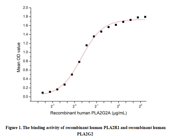 Phospholipase A2 Receptor 1 (PLA2R1) is a type I transmembrane glycoprotein belonging to the mannose receptor family. It is primarily expressed on the surface of podocytes in the kidney glomerulus and plays important roles in cell senescence, apoptosis, and maintaining glomerular filtration barrier function. PLA2R1 has gained significant clinical attention as it is identified as the major autoantigen in primary membranous nephropathy, where autoantibodies against PLA2R1 are pathogenic drivers of the disease. Besides, PLA2R1 functions as a specific receptor that binds secreted PLA2G2, thus a functional binding ELISA assay was conducted to detect the interaction of recombinant human PLA2R1 and recombinant human PLA2G2. Briefly, PLA2G2 was diluted serially in PBS with 0.01% BSA (pH 7.4). Duplicate samples of 100 μl were then transferred to PLA2R1-coated microtiter wells and incubated for 1h at 37℃. Wells were washed with PBST and incubated for 1h with anti-PLA2G2 pAb, then aspirated and washed 3 times. After incubation with HRP labelled secondary antibody for 1h at 37℃, wells were aspirated and washed 5 times. With the addition of substrate solution, wells were incubated 15-25 minutes at 37℃. Finally, add 50 µL stop solution to the wells and read at 450/630nm immediately. Measured by its binding ability in a functional ELISA. When Recombinant PLA2R1 is lmmobilized at 2 µg/mL(100 uLwell), the concentration of PLA2G2 that produces 50% optimal bindingresponse is found to be approximately 0.12 µg/mL.