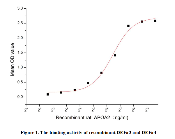 Defensin Alpha 3, Neutrophil Specific (DEFa3) is a cationic antimicrobial peptide belonging to the alpha-defensin family, primarily expressed in neutrophils and epithelial tissues. It exhibits potent broad-spectrum activity against Gram-positive/negative bacteria, fungi, and enveloped viruses by disrupting microbial membranes. Beyond direct pathogen clearance, DEFa3 modulates immune signaling and enhances phagocyte function, reinforcing host innate immunity. DEFa3 binds with DEFa4 (DEF4), forming heterodimers to synergistically amplify antimicrobial and immunomodulatory effects. Briefly, DEFa3 was diluted serially in PBS with 0.01% BSA (pH 7.4). Duplicate samples of 100 μl were then transferred to DEFa4-coated microtiter wells and incubated for 1h at 37℃. Wells were washed with PBST and incubated for 1h with anti-DEFa3 pAb, then aspirated and washed 3 times. After incubation with HRP labelled secondary antibody for 1h at 37℃, wells were aspirated and washed 5 times. With the addition of substrate solution, wells were incubated 15-25 minutes at 37℃. Finally, add 50 µL stop solution to the wells and read at 450/630nm immediately.Measured by its binding ability in a functional ELISA. When Recombinant DEFa4 is lmmobilized at 2 µg/mL(100 uLwell), the concentration of DEFa3 that produces 50% optimal bindingresponse is found to be approximately 1.10488 µg/mL.