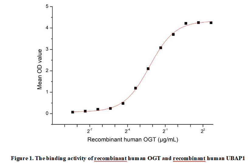 O-Linked-N-Acetylglucosamine Transferase (OGT) is a key enzyme that catalyzes the addition of N-acetylglucosamine (O-GlcNAc) to serine or threonine residues of target proteins via O-glycosylation. This post-translational modification plays a critical role in cellular processes such as signal transduction, transcription regulation, and stress response. OGT is highly conserved across species and is essential for cell viability. Dysregulation of OGT activity has been linked to metabolic disorders, neurodegenerative diseases, and cancer. The enzyme's ability to modulate protein function dynamically, akin to phosphorylation, highlights its importance in maintaining cellular homeostasis.Besides,Ubiquitin Associated Protein 1 (UBAP1) has been identified as an interactor of OGT, thus a functional binding ELISA assay was conducted to detect the interaction of recombinant human OGT and recombinant human UBAP1 . Briefly, biotin-linked OGT were diluted serially in PBS, with 0.01% BSA (pH 7.4). Duplicate samples of 100μl were then transferred to UBAP1-coated microtiter wells and incubated for 1h at 37℃. Wells were washed with PBST 3 times and incubation with Streptavidin-HRP for 30min, then wells were aspirated and washed 5 times. With the addition of substrate solution, wells were incubated 15-25 minutes at 37℃. Finally, add 50µl stop solution to the wells and read at 450nm immediately. The binding activity of recombinant human OGT and recombinant human UBAP1 was shown in Figure 1, the EC50 for this effect is 0.21 µg/mL.