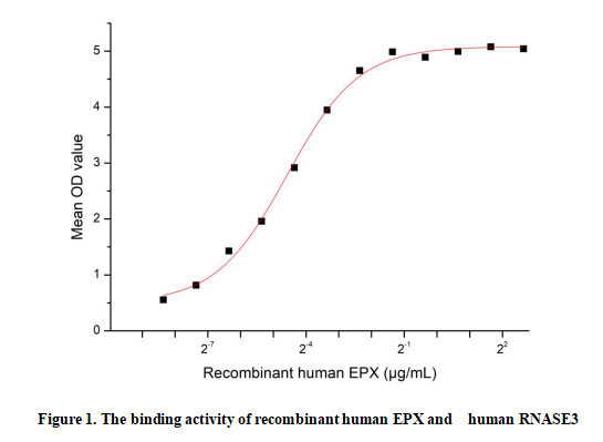 Eosinophil Peroxidase (EPX) is a key enzyme exclusively expressed in eosinophils, a type of white blood cell. It plays a central role in the immune system’s defense against parasitic infections and participates in regulating inflammatory responses. EPX catalyzes the production of hypohalous acids, which exhibit strong antimicrobial activity to eliminate pathogens. Abnormal EPX expression or function is linked to allergic diseases like asthma and chronic eosinophilic disorders. EPX and Ribonuclease A3 (RNASE3) interact in eosinophils; this binding modulates their respective antimicrobial and pro-inflammatory activities to coordinate immune responses.To detect the activity of recombinant EPX , a functional ELISA assay was performed to evaluate the interaction between recombinant human EPX and recombinant human RNASE3.Briefly, EPX was diluted serially in PBS with 0.01% BSA (pH 7.4). Duplicate samples of 100 μl were then transferred to RNASE3-coated microtiter wells and incubated for 1h at 37℃. Wells were washed with PBST and incubated for 1h with anti-EPX pAb, then aspirated and washed 3 times. After incubation with HRP labelled secondary antibody for 1h at 37℃, wells were aspirated and washed 5 times. With the addition of substrate solution, wells were incubated 15-25 minutes at 37℃. Finally, add 50 µL stop solution to the wells and read at 450/630nm immediately. The binding activity of recombinant human EPX and human RNASE3