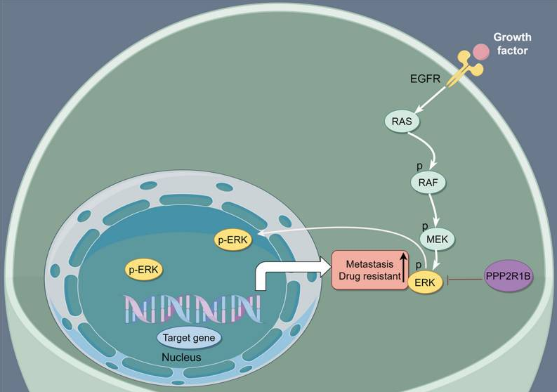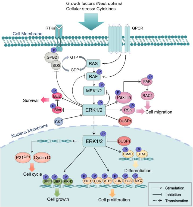 The MAPK/ERK pathway is mainly activated by ligand-stimulated receptor tyrosine kinases (RTK) on the plasma membrane, and can also be activated by G protein-coupled receptors (GPCRS). Then, the RTK signal is transmitted through growth factor receptor-binding protein 2 (Grb2) and SOS, activating the small GTPase Ras, recruiting Ras and Ser/Thr kinase Raf to the plasma membrane to form a complex, and activating Raf by inducing the phosphorylation/dephosphorylation of serine residues on Raf. The active Raf successively phosphorylates and activates MEK1/2. MEK1/2 respectively phosphorylates the ERK1/2 protein, thereby activating ERK1/2. ERK1/2 activates or inactivates multiple proteins through phosphorylation in different subcellular compartments, and can also rapidly shuttle into the cell nucleus to regulate cellular transcriptional activity by phosphorylating multiple transcription factor targets. In addition, ERK1/2 can serve as a negative feedback regulatory mechanism, phosphorylating upstream kinases in the ERK pathway, such as SOS and MEK.