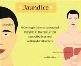 Jaundice, also known as icterus, is a yellowish or greenishpigmentation of the skin and whites of the eyes due to high bilirubin levels. It is commonly associated with itchiness. The feces may be pale and the urine dark. Jaundice in babiesoccurs in over half in the first week following birth and in most is not a problem. If bilirubin levels in babies are very high for too long a type of brain damage, known as kernicterus, may occur. High unconjugated bilirubin may be due to excess red blood cell breakdown, large bruises, genetic conditions such as Gilbert's syndrome, no eating for a prolonged period of time, newborn jaundice, or thyroid problems. High conjugated bilirubin may be due to liver diseases such as cirrhosis or hepatitis, infections, medications, or blockage of the bile duct.