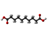 Sebacic acid is a naturally occurring dicarboxylic acid with the structure (HOOC)(CH2)8(COOH). In its pure state it is a white flake or powdered crystal. The product is described as non-hazardous, though in its powdered form it can be prone to flash ignition (a typical risk in handling fine organic powders). Sebaceus is Latin for tallow candle, sebum (tallow) is Latin for tallow, and refers to its use in the manufacture of candles. Sebacic acid is a derivative of castor oil, with the vast majority of world production occurring in China which annually exports over 20,000 metric tonnes, representing over 90% of global trade of the product. In the industrial setting, sebacic acid and its homologues such as azelaic acid can be used in plasticizers, lubricants, hydraulic fluids, cosmetics, candles, etc. Sebacic acid is also used as an intermediate for aromatics, antiseptics, and painting materials.