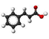 Cinnamic acid is an organic compound with the formula C6H5CHCHCO2H. It is a white crystalline compound that is slightly soluble in water. Classified as an unsaturated carboxylic acid, it occurs naturally in a number of plants. It is freely soluble in many organic solvents. It exists as both a cis and a trans isomer, although the latter is more common. The original synthesis of cinnamic acid involves the Perkin reaction, which entails the base-catalysed condensation of acetic anhydride and benzaldehyde. Cinnamic acid is used in flavors, synthetic indigo, and certain pharmaceuticals. A major use is in the manufacturing of the methyl, ethyl, and benzyl esters for the perfume industry. Cinnamic acid is a precursor to the sweetener aspartame via enzyme-catalysed amination to phenylalanine. Cinnamic acid is also a kind of self-inhibitor produced by fungal spore to prevent germination.
