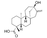 Steviol is a diterpene first isolated from Stevia rebaudiana in 1931. Its chemical structure was not fully elucidated until 1960. Steviol is found in the form of glycosides including the sweet chemical compound stevioside. Steviol glycosides are responsible for the sweet taste of the leaves of the stevia plant (Stevia rebaudiana Bertoni). The diterpene known as steviol is the aglycone of stevia's sweet glycosides, which are constructed by replacing steviol's carboxyl hydrogen atom (at the bottom left of the figure) with glucose to form an ester, and replacing the hydroxyl hydrogen (at the top of the figure) with combinations of glucose and rhamnose to form an acetal. The two primary compounds, stevioside and rebaudioside A, use only glucose: Stevioside has two linked glucose molecules at the hydroxyl site, whereas rebaudioside A has three, with the middle glucose of the triplet connected to the central steviol structure.