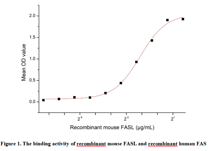 Fas ligand (FASL) is a 40 kDa type II membrane protein belonging to the TNF family, referred to as TNFSF6 in the new TNF superfamily nomenclature. Its specific receptor is FAS (CD95, Apo-1), a 45 kDa type I transmembrane protein of the TNF receptor family. FASL is mainly expressed on activated T cells and NK cells, while FAS is present on various cell types. The FAS/FASL system is crucial for regulating immune responses by inducing cell apoptosis, thereby maintaining homeostasis, lymphocyte self-tolerance, and immune privilege. FASL has also been reported as a potent neutrophil chemoattractant, indicating a new proinflammatory function. Additionally, a functional binding ELISA assay was used to detect the interaction between recombinant mouse FASL and recombinant human FAS.biotin-linked FASL were diluted serially in PBS, with 0.01% BSA (pH 7.4). Duplicate samples of 100µl were then transferred to FAS-coated microtiter wells and incubated for 1h at 37℃. Wells were washed with PBST 3 times and incubation with Streptavidin-HRP for 30min, then wells were aspirated and washed 5 times. With the addition of substrate solution, wells were incubated 15-25 minutes at 37℃. Finally, add 50µl stop solution to the wells and read at 450nm immediately. The binding activity of FASL and FAS was shown in Figure 1, the EC50 for this effect is 0.46 µg/mL.