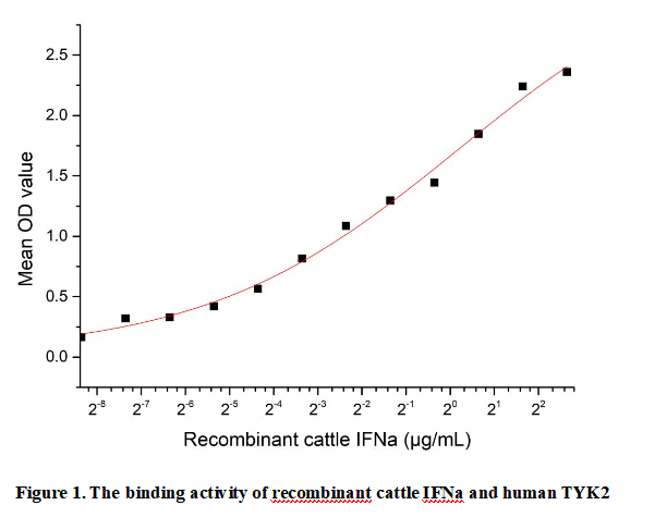 Interferon Alpha (IFNa) is a pleiotropic cytokine belonging to the type I interferon family, primarily secreted by immune cells such as plasmacytoid dendritic cells in response to viral infections and other pathogens. It plays a central role in the innate immune response by inducing the expression of hundreds of interferon-stimulated genes (ISGs) that exert antiviral, antiproliferative, and immunomodulatory effects. IFNa signals through a cell-surface receptor complex composed of IFNAR1 and IFNAR2, initiating a cascade of intracellular events that are critical for host defense against viruses and for regulating immune homeostasis. Dysregulation of IFNa signaling is implicated in various autoimmune diseases, highlighting its importance in maintaining immune balance. IFNa binding to its receptor induces the activation of TYK2, which is constitutively associated with the IFNAR1 subunit, thereby initiating downstream JAK-STAT signaling.Thus a functional ELISA assay was conducted to detect the interaction of recombinant cattle IFNa and recombinant human TYK2. Briefly, IFNa was diluted serially in PBS with 0.01% BSA (pH 7.4). Duplicate samples of 100 μl were then transferred to TYK2-coated microtiter wells and incubated for 1h at 37℃. Wells were washed with PBST and incubated for 1h with anti-IFNa pAb, then aspirated and washed 3 times. After incubation with HRP labelled secondary antibody for 1h at 37℃, wells were aspirated and washed 5 times. With the addition of substrate solution, wells were incubated 15-25 minutes at 37℃. Finally, add 50 µL stop solution to the wells and read at 450/630nm immediately. The binding activity of recombinant cattle IFNa and recombinant hunan TYK2 was shown in Figure 1, the EC50 for this effect is 1.14µg/mL.