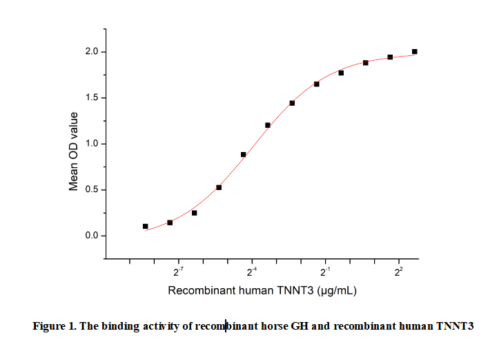 Growth Hormone (GH), also known as somatotropin, is a peptide hormone synthesized and secreted by the somatotroph cells of the anterior pituitary gland. It plays a pivotal role in growth regulation, metabolism, and cellular repair across multiple tissues. GH exerts its effects both directly and indirectly through the stimulation of insulin-like growth factor 1 (IGF-1) production in the liver. The hormone binds to the growth hormone receptor (GHR), a member of the cytokine receptor superfamily, activating the JAK2-STAT signaling pathway to regulate gene expression. GH secretion is pulsatile, primarily controlled by hypothalamic growth hormone-releasing hormone (GHRH) and somatostatin. Beyond its growth-promoting functions, GH influences lipid metabolism, glucose homeostasis, and immune function.Besides,Troponin T Type 3, Fast Skeletal (TNNT3) has been identified as an interactor of GH, thus a functional binding ELISA assay was conducted to detect the interaction of recombinant horse GH and recombinant human TNNT3. Briefly, TNNT3 was diluted serially in PBS with 0.01% BSA (pH 7.4). Duplicate samples of 100 μl were then transferred to GH-coated microtiter wells and incubated for 1h at 37℃. Wells were washed with PBST and incubated for 1h with anti-TNNT3 pAb, then aspirated and washed 3 times. After incubation with HRP labelled secondary antibody for 1h at 37℃, wells were aspirated and washed 5 times. With the addition of substrate solution, wells were incubated 15-25 minutes at 37℃. Finally, add 50 µL stop solution to the wells and read at 450/630nm immediately. Measured by its binding ability in a functional ELISA. When Recombinant GH is lmmobilized at 2 ug/mL(100 uLwell), the concentration of TNNT3 that produces 50% optimal bindingresponse is found to be approximately 0.064µg/mL.