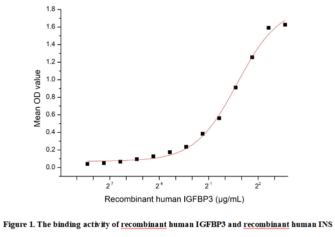 Insulin-like growth factor-binding protein 3, also known as IGFBP3 is one of six IGF binding proteins (IGFBP1 to IGFBP6) that have highly conserved structures and bind the insulin-like growth factors IGF-1 and IGF-2 with high affinity. Within tissues, IGFBP3 can bind IGF1 and IGF2 released by many cell types, and block their access to the IGF-1 receptor (IGF1R), which is activated by both IGFs. IGFBP3 also interacts with cell-surface proteins, affecting cell signaling from outside the cell or after internalization, and also enters the cell nucleus where it binds to nuclear hormone receptors and other ligands. Besides, Insulin (INS) has been identified as an interactor of IGFBP3, thus a binding ELISA assay was conducted to detect the interaction of recombinant human IGFBP3 and recombinant human INS. Briefly, biotin-linked IGFBP3 were diluted serially in PBS, with 0.01% BSA (pH 7.4). Duplicate samples of 100μl were then transferred to INS-coated microtiter wells and incubated for 1h at 37℃. Wells were washed with PBST 3 times and incubation with Streptavidin-HRP for 30min, then wells were aspirated and washed 5 times. With the addition of substrate solution, wells were incubated 15-25 minutes at 37℃. Finally, add 50µl stop solution to the wells and read at 450nm immediately. The binding activity of IGFBP3 and INS was shown in Figure 1, the EC50 for this effect is 0.166 µg/mL.
