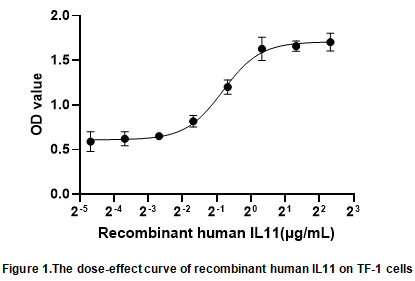 Interleukin 11 (IL-11) is a multifunctional cytokine. It is a key regulator of multiple events in hematopoiesis, most notably the stimulation of megakaryocyte maturation. IL-11 has been demonstrated to improve platelet recovery after chemotherapy-induced thrombocytopenia, induce acute phase proteins, modulate antigen-antibody responses and participate in the regulation of bone cell proliferation and differentiation. Besides, IL-11 has been proved to promote cell proliferation of TF-1 cells. 2x104 TF-1 cells were seeded into a well of 96-well plates and allowed to attach, replaced with various concentrations of recombinant human TRAIL. After incubated for 72 hours, the 96-well plate was read at OD450 nm. The result was shown in Figure1. It was obvious that recombinant IL-11 protein significantly increased cell viability of TF-1 cells. Its EC50 is 0.5677μg/mL.