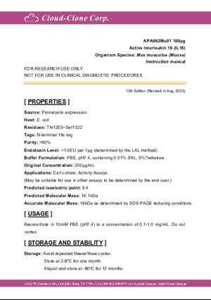 | APA062Mu01 | Active Interleukin 16 (IL16) | Cell culture; Activity Assays. |
