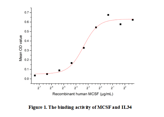 M-CSF (Macrophage Colony-Stimulating Factor), encoded by the CSF1 gene in humans, is a crucial cytokine that regulates the survival, proliferation, and differentiation of mononuclear phagocytes, including macrophages and their precursors. It binds to its receptor, CSF1R, activating signaling pathways essential for innate immunity, tissue homeostasis, and bone remodeling. M-CSF also plays roles in inflammatory diseases and cancer, where it can promote tumor-associated macrophage infiltration, supporting tumor progression. Its functions extend beyond hematopoiesis to include roles in metabolic regulation and neural development, making it a therapeutic target for conditions like autoimmune disorders and certain cancers.Besides,IL34 has been identified as an interactor of MCSF, thus a functional binding ELISA assay was conducted to detect the interaction of recombinant human MCSF and recombinant human IL34 . Briefly, biotin-linked MCSF were diluted serially in PBS, with 0.01% BSA (pH 7.4). Duplicate samples of 100µl were then transferred to IL34-coated microtiter wells and incubated for 1h at 37℃. Wells were washed with PBST 3 times and incubation with Streptavidin-HRP for 30min, then wells were aspirated and washed 5 times. With the addition of substrate solution, wells were incubated 15-25 minutes at 37℃. Finally, add 50µl stop solution to the wells and read at 450nm immediately. The binding activity of MCSF and IL34 was shown in Figure 1, the EC50 for this effect is 0.09587µg/mL.