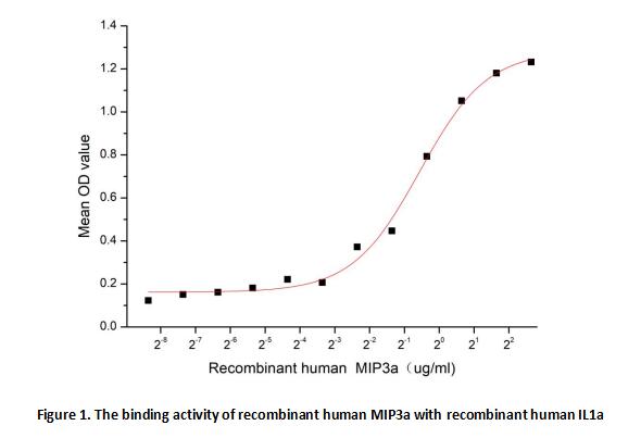 Macrophage Inflammatory Protein 3 Alpha (MIP3a) also known as Chemokine (C-C motif) ligand 20 (CCL20) or liver activation regulated chemokine (LARC) is a small cytokine belonging to the CC chemokine family. It is strongly chemotactic for lymphocytes and weakly attracts neutrophils. MIP3a is implicated in the formation and function of mucosal lymphoid tissues via chemoattraction of lymphocytes and dendritic cells towards the epithelial cells surrounding these tissues. It is expressed in several tissues such as peripheral blood lymphocytes, lymph nodes, liver, appendix, fetal lung. Expression of MIP3a can be induced by microbial factors such as lipopolysaccharide (LPS), and inflammatory cytokines such as tumor necrosis factor and interferon-γ, and down-regulated by IL-10. Besides, lnterleukin 1 Alpha (IL1a) has been identified as an interactor of MIP3a, thus a binding ELISA assay was conducted to detect the interaction of recombinant human MIP3a and recombinant human IL1a. Briefly, MIP3a were diluted serially in PBS, with 0.01% BSA (pH 7.4). Duplicate samples of 100 ul were then transferred to IL1a-coated microtiter wells and incubated for 2h at 37℃. Wells were washed with PBST and incubated for 1h with anti-MIP3a pAb, then aspirated and washed 3 times. After incubation with HRP labelled secondary antibody, wells were aspirated and washed 5 times. With the addition of substrate solution, wells were incubated 15-25 minutes at 37℃. Finally, add 50 µL stop solution to the wells and read at 450nm immediately. The binding activity of MIP3a and IL1a was shown in Figure 1, and this effect was in a dose dependent manner, the EC50 for this effect is 0.676 ug/mL.