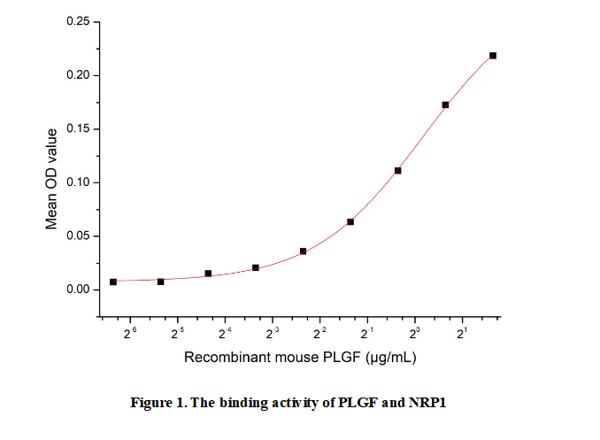 A114Mu is a research-grade monoclonal antibody specifically targeting Placenta Growth Factor (PLGF). Monoclonal antibodies like A114Mu are laboratory-engineered proteins designed to bind to a single, precise epitope on their target molecule—here, PLGF. Its development stems from the need to study PLGF’s biological roles, particularly in angiogenesis (blood vessel formation) and pathological conditions such as cancer and preeclampsia. A114Mu enables researchers to block PLGF activity in vitro and in vivo, helping elucidate its interactions with receptors like VEGFR-1. This tool is critical for validating PLGF as a therapeutic target, as its inhibition may suppress abnormal blood vessel growth in tumors or regulate placental vascular development in pregnancy-related disorders.To detect the activity of recombinant PLGF, a functional ELISA assay was performed to evaluate the interaction between recombinant human PLGF and recombinant human NRP1.Briefly, biotin-linked PLGF were diluted serially in PBS, with 0.01% BSA (pH 7.4). Duplicate samples of 100µl were then transferred to NRP1-coated microtiter wells and incubated for 1h at 37℃. Wells were washed with PBST 3 times and incubation with Streptavidin-HRP for 30min, then wells were aspirated and washed 5 times. With the addition of substrate solution, wells were incubated 15-25 minutes at 37℃. Finally, add 50µl stop solution to the wells and read at 450nm immediately. The binding activity of PLGF and NRP1 was shown in Figure 1, the EC50 for this effect is 1.12355µg/mL.