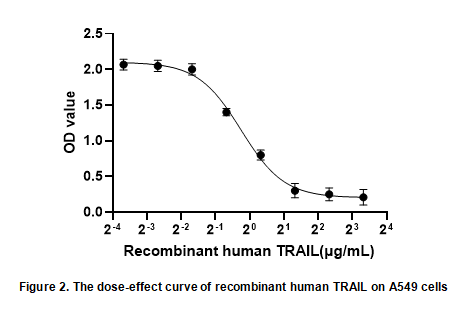 Tumor Necrosis Factor Related Apoptosis Inducing Ligand (TRAIL) is a recently identified member of the TNF gene superfamily. TRAIL is widely expressed in a variety of human tissues, most predominantly in lung, spleen and prostat. As its name suggests, TRAIL was primarily of particular interest for its ability to selectively induce apoptosis in tumour cells in vitro and in vivo, while apparently exhibiting minimal off-target effects. In order to test the effect of human recombinant TRAIL protein on cell apoptosis, 2x104 A549 cells were seeded into quintuplicate wells of 96-well plates and allowed to attach, replaced with various concentrations of recombinant human TRAIL. After incubated for 72 hours, the 96-well plates were read at OD450 nm. The result was shown in Figure1. It was obvious that rmTRAIL significantly decreased cell viability of A549 cells. The ED50 of recombinant human TRAIL is 0.84 μg/mL.