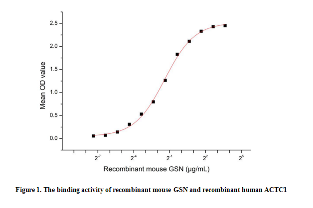 Gelsolin (GSN) is a ubiquitous, multifunctional actin-binding protein that plays a pivotal role in remodeling the cytoskeleton by severing, capping, and nucleating actin filaments. This calcium-dependent regulation is essential for critical cellular processes including cell motility, shape changes, and the clearance of cellular debris post-injury. By controlling the dynamics of actin assembly and disassembly, GSN influences a wide range of physiological functions from wound healing to platelet activation. Importantly, GSN directly binds to ACTC1, the primary actin isoform in cardiac muscle, to regulate the contractile apparatus and maintain heart function.To detect the activity of recombinant GSN , a functional ELISA assay was performed to evaluate the interaction between recombinant mouse GSN and recombinant human ACTC1.Briefly, GSN was diluted serially in PBS with 0.01% BSA (pH 7.4). Duplicate samples of 100 μl were then transferred to ACTC1-coated microtiter wells and incubated for 1h at 37℃. Wells were washed with PBST and incubated for 1h with anti-GSN pAb, then aspirated and washed 3 times. After incubation with HRP labelled secondary antibody for 1h at 37℃, wells were aspirated and washed 5 times. With the addition of substrate solution, wells were incubated 15-25 minutes at 37℃. Finally, add 50 µL stop solution to the wells and read at 450/630nm immediately. The binding activity of recombinant mouse GSN and recombinant human ACTC1 was shown in Figure 1, the EC50 for this effect is 0.38µg/mL.