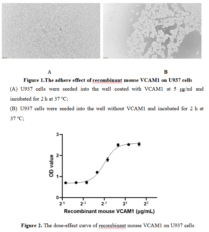Vascular Cell Adhesion Molecule 1 (VCAM1) is a type I transmembrane glycoprotein belonging to the immunoglobulin superfamily of adhesion molecules. It is primarily expressed on the surface of endothelial cells, though its expression can be induced in other cell types such as smooth muscle cells, fibroblasts, and macrophages in response to pro-inflammatory cytokines like TNF-α, IL-1β, and IFN-γ. As VCAM1 has the function of cell adhesion, we measure the activity of recombinant mouse VCAM1 by the ability of the immobilized protein to support the adhesion of U937 cells. When cells are added to different concentrations of recombinant mouse VCAM1 coated plates, cells will adhere after 2 hour incubation at 37 ℃. The adhesion of U937 after 2 hour incubation at 37 ℃ observed by inverted microscope was shown in Figure 1. Cells adherent was in a dose dependent manner, the result was shown in Figure 2, the EC50 was 0.50 μg/ml.