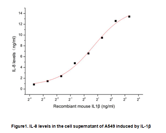 Interleukin 1 beta (IL-1β) also known as leukocytic pyrogen, leukocytic endogenous mediator, mononuclear cell factor, lymphocyte activating factor and other names, is a member of the interleukin 1 family of cytokines. This cytokine is an important mediator of the inflammatory response, and is involved in a variety of cellular activities, including cell proliferation, differentiation, and apoptosis. It has been reported that IL-1β can induced IL-8 production in A549 cells. To test the bioactivity of IL-1β, A549 cells were seeded into 24-well plate at a density of 1x105 cells/mL , and allowed to attach overnight before treated with certain concentrations of IL-1β for 24h and IL-8 levels in the cell supernatant were determined by ELISA. IL-8 levels in the cell supernatant of A549 cells increased significantly after stimulated with IL-1β have shown in Figure1, the EC50 was 1.54 ng/ml.
