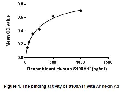 S100A11 is a member of the S100 calcium-binding protein family ,it contains two EF-hand calcium-binding motifs and shares 82% amino acid sequence identity with mouse and rat S100A11 . S100 proteins are localized in the cytoplasm and nucleus of a wide range of cells, and involved in the regulation of a number of cellular processes such as cell cycle progression and differentiation. This protein may function in motility, invasion, and tubulin polymerization. Chromosomal rearrangements and altered expression of this gene have been implicated in tumor metastasis .When extracellular calcium concentrations elevate ,S100A11 will associate with S100B as well as Annexins A1, A2, and A6. S100A11-Annexin A2 complexes are recruited to sites of plasma membrane damage where they facilitate membrane repair in migrating cancer cells. Thus a binding ELISA assay was conducted to detect the interaction of S100A11 and Annexin A2. Briefly, recombinant human S100A11 were diluted serially in PBS, with 0.01%BSA (pH 7.4). Duplicate samples of 100ul were then transferred to Annexin A2-coated microtiter wells and incubated for 2h at 37°C. Wells were washed with PBST and incubated for 1 h with anti-S100A11 mAb, then aspirated and washed 3 times. After incubation with HRP labelled secondary antibody, wells were aspirated and washed 3 times. With the addition of substrate solution , wells were incubated 15-25 minutes at 37°C. Finally, add 50µL stop solution to the wells and read at 450nm immediately. The binding activity of of S100A11 and Annexin A2 was shown in Figure 1, and this effect was in a dose dependent manner.