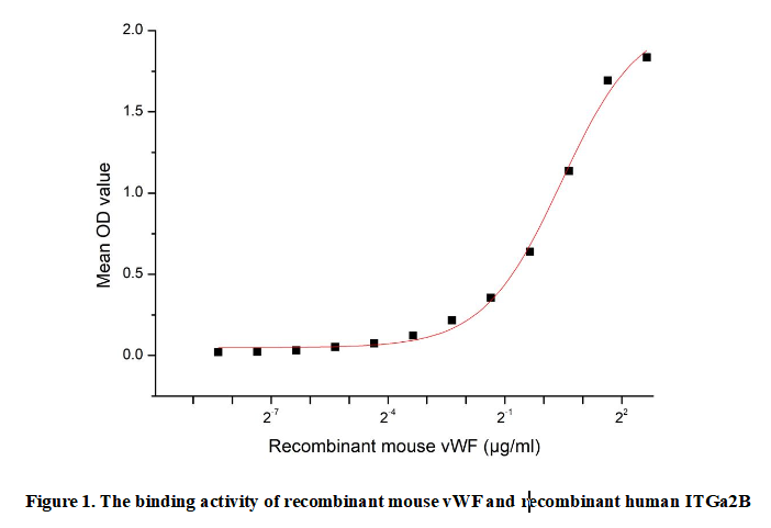 Von Willebrand Factor (vWF) , a large multimeric plasma glycoprotein , is synthesized mainly by endothelial cells and megakaryocytes. The protein consists of multiple subunits, forming high - molecular - weight multimers. These multimers have emerged as a key player in both primary and secondary hemostasis.Besides,Von Willebrand Factor (vWF) specifically interacts with the Integrin Alpha 2B (ITGa2B) of the platelet membrane receptor complex, forming a critical molecular interaction that facilitates platelet aggregation and subsequent thrombus formation, thus a functional binding ELISA assay was conducted to detect the interaction of recombinant mouse vWF and recombinant human ITGa2B . Briefly, biotin-linked vWF were diluted serially in PBS, with 0.01% BSA (pH 7.4). Duplicate samples of 100μl were then transferred to ITGa2B-coated microtiter wells and incubated for 1h at 37℃. Wells were washed with PBST 3 times and incubation with Streptavidin-HRP for 30min, then wells were aspirated and washed 5 times. With the addition of substrate solution, wells were incubated 15-25 minutes at 37℃. Finally, add 50µl stop solution to the wells and read at 450nm immediately. The binding activity of vWF and ITGa2B was shown in Figure 1, the EC50 for this effect is 1.36µg/mL.
