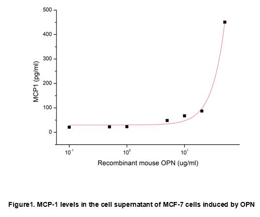 Osteopontin (OPN), a multifunctional phosphorylated glycoprotein, plays an important role in neutrophil recruitment and was found to induce the expression of proinflammatory chemokines including MCP-1 and MIP-1β which promote migration and recruitment of inflammatory cells. It has been reported that OPN induces MCP-1 expression through the NF-kappaB pathways in MCF-7 breast cancer cell line. To test the bioactivity of recombinant mouse OPN, MCF-7 cells were seeded into 24-well plate at a density of 1x105 cells/mL , and allowed to attach overnight before treated with certain concentrations of recombinant mouse OPN for 48h and MCP-1 levels in the cell supernatant were determined by ELISA (SEA087Hu). MCP-1 levels in the cell supernatant of MCF-7 cells increased significantly after stimulated with OPN which was shown in Figure1, the EC50 was 398 ug/ml.