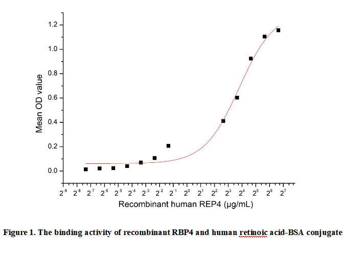 Retinol Binding Protein 4 (RBP4) is a 21-kDa secreted glycoprotein belonging to the lipocalin family, predominantly synthesized in the liver and adipose tissue. It functions as the primary carrier of retinol (vitamin A) in the bloodstream, facilitating retinol transport to target tissues and regulating systemic vitamin A homeostasis. RBP4 plays critical roles in vision, epithelial cell differentiation, immune function, and metabolic regulation, with dysregulation linked to obesity, type 2 diabetes, and cardiovascular diseases. RBP4 binds to retinoic acid-BSA conjugate, enabling targeted delivery of retinoic acid and enhancing its bioavailability in biological systems.Thus a functional ELISA assay was conducted to detect the interaction of recombinant human RBP4 and recombinant human retinoic acid-BSA conjugate. Briefly, RBP4 was diluted serially in PBS with 0.01% BSA (pH 7.4). Duplicate samples of 100 μl were then transferred to retinoic acid-BSA conjugate-coated microtiter wells and incubated for 1h at 37℃. Wells were washed with PBST and incubated for 1h with anti-RBP4 pAb, then aspirated and washed 3 times. After incubation with HRP labelled secondary antibody for 1h at 37℃, wells were aspirated and washed 5 times. With the addition of substrate solution, wells were incubated 15-25 minutes at 37℃. Finally, add 50 µL stop solution to the wells and read at 450/630nm immediately. The binding activity of recombinant rat RBP4 and recombinant human retinoic acid-BSA conjugate was shown in Figure 1, the EC50 for this effect is 13.88µg/mL.