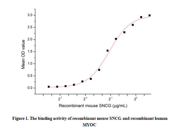 Gamma-synuclein (SNCG) is a member of the synuclein family, primarily expressed in the nervous system and certain cancer tissues. Unlike its well-studied counterpart alpha-synuclein involved in Parkinson's disease, SNCG plays distinct roles in tumor progression and metastasis. It promotes cancer cell proliferation, invasion, and chemoresistance in breast, ovarian, and liver cancers by modulating cytoskeletal dynamics and signaling pathways such as ERK, AKT. SNCG overexpression correlates with poor prognosis in multiple malignancies. Additionally, it interacts with tubulin and other synaptic proteins, though its physiological functions in normal neurons remain less understood.Besides,Myocilin (MYOC) has been identified as an interactor of SNCG, thus a functional binding ELISA assay was conducted to detect the interaction of recombinant mouse SNCG and recombinant human MYOC. Briefly, SNCG was diluted serially in PBS with 0.01% BSA (pH 7.4). Duplicate samples of 100 μl were then transferred to MYOC-coated microtiter wells and incubated for 1h at 37℃. Wells were washed with PBST and incubated for 1h with anti-SNCG pAb, then aspirated and washed 3 times. After incubation with HRP labelled secondary antibody for 1h at 37℃, wells were aspirated and washed 5 times. With the addition of substrate solution, wells were incubated 15-25 minutes at 37℃. Finally, add 50 µL stop solution to the wells and read at 450/630nm immediately. The binding activity of recombinant mouse SNCG and recombinant human MYOC was shown in Figure 1, the EC50 for this effect is 0.45µg/mL.