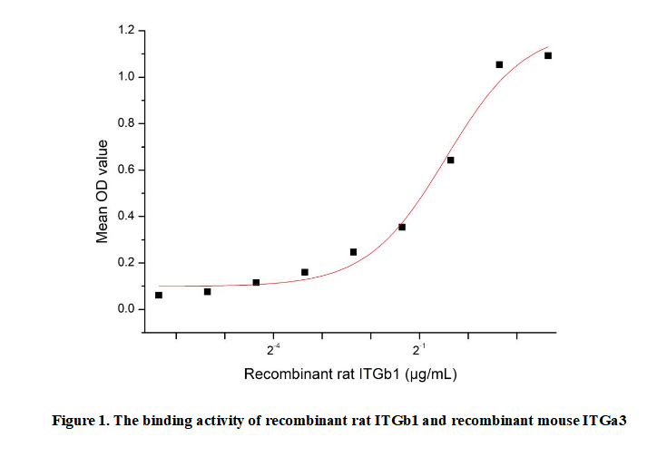 Integrin Beta 1 (ITGb1), also known as CD29, is a fundamental subunit of the integrin family of adhesion receptors. It is ubiquitously expressed on cell surfaces and can heterodimerize with various alpha subunits to form distinct integrins. These heterodimers are crucial for mediating bidirectional signaling between the cell and its extracellular matrix (ECM), influencing essential processes such as cell adhesion, migration, proliferation, and survival. ITGb1 binds to ECM proteins like fibronectin and laminin, playing a vital role in embryonic development, tissue repair, and immune responses. Specifically, ITGb1 non-covalently associates with Integrin Alpha 3 (ITGa3) to form a functional receptor for laminin-5 in epithelial cells.To detect the activity of recombinant ITGb1, a functional ELISA assay was performed to evaluate the interaction between recombinant rat ITGb1 and recombinant mouse ITGa3. Briefly, biotin-linked ITGb1 were diluted serially in PBS, with 0.01% BSA (pH 7.4). Duplicate samples of 100µl were then transferred to ITGa3-coated microtiter wells and incubated for 1h at 37℃. Wells were washed with PBST 3 times and incubation with Streptavidin-HRP for 30min, then wells were aspirated and washed 5 times. With the addition of substrate solution, wells were incubated 15-25 minutes at 37℃. Finally, add 50µl stop solution to the wells and read at 450nm immediately. The binding activity of recombinant rat ITGb1 and recombinant mouse ITGa3 was shown in Figure 1, the EC50 for this effect is 0.73µg/mL.