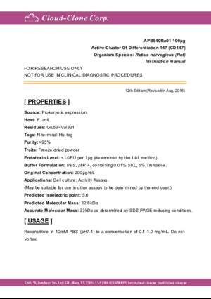 Extracellular matrix metalloproteinase (MMP) inducer (EMMPRIN), also known as basigin and CD147, is a 4466 kDa, variably N and Oglycosylated, type I transmembrane protein that belongs to the immunoglobulin superfamily. EMMPRIN is 269 amino acids (aa) in length and contains a 24 aa signal sequence, a 183 aa extracellular domain (ECD), a 21 aa transmembrane (TM) segment and a 41 aa cytoplasmic tail. The ECD contains one C2type and one Vtype Iglike domain. EMMPRIN is expressed in areas of tissue remodeling, including endometrium, placenta, skin, and regions undergoing angiogenesis. It is also expressed on cells with high metabolic activity, such as lymphoblasts, macrophages and particularly tumor cells. A functional ELISA assay was conducted to detect the interaction of recombinant rat EMMPRIN/CD147 and recombinant human ITGb1. Briefly, CD147 was diluted serially in PBS with 0.01% BSA (pH 7.4). Duplicate samples of 100 μl were then transferred to Spike glycoprotein-coated microtiter wells and incubated for 1h at 37℃. Wells were washed with PBST and incubated for 1h with anti-CD147 pAb, then aspirated and washed 3 times. After incubation with HRP labelled secondary antibody for 1h at 37℃, wells were aspirated and washed 5 times. With the addition of substrate solution, wells were incubated 15-25 minutes at 37℃. Finally, add 50 µL stop solution to the wells and read at 450/630nm immediately. The binding activity of recombinant rat CD147 and recombinant human ITGb1 was shown in Figure 1, the EC50 for this effect is 0.166 ug/mL.